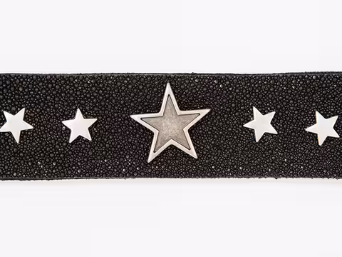 Imposantes Hundehalsband aus Perlrochenhaut in Kombination mit 2-3 mm starken Bullendickleder. Ins Auge fallen sofort die vier silberfarbenen fünfzackigen Sterne in der Mitte des Halsbandes: ein großer, flankiert von jeweils zwei kleinen. Passend hierzu ist die altsilberfarbene Schnalle aus Druckguss. Die zu Leder gegerbte Rochenhaut verstärkt diese eindrucksvolle Optik zusätzlich. Gleichzeitig sorgt das extrem weiche Bullendickleder für einen besonders komfortablen Sitz.