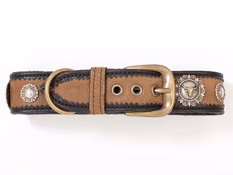 Hundehalsband aus Rindernubuk mit einem Zackenrand aus Ziegennappa und einer 2-3 mm starken Unterfütterung aus äußerst weichem und anschmiegsamem Allgäuer Bullendickleder. Eingearbeitet sind eindrucksvolle runde Conchos, die einen mächtigen Ochsenkopf zeigen. Einen überraschenden Kontrast hierzu bilden die zwischen diesen Applikationen eingefügten blumenzarten Zierelemente. Weitere Zierelemente sind um die altsilberfarbene Schnalle aus Druckguss angebracht.