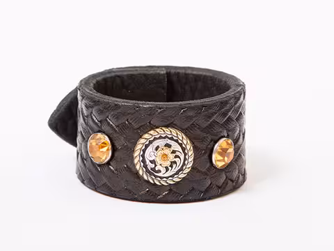 Beinahe filigranes Armband aus Lammnappa. Als Verzierung dient ein mit stilisierten Blüten umfasster Concho. In der Mitte dieser Ziermünzen ist ein wunderschöner gelber Faux-Topas-Stein eingelassen, der von einem anmutigen Blumenmotiv mit Silberauflage umschlossen wird. Flankiert wird der Concho von jeweils einem gold schimmernden Faux-Topas-Stein. Breite: ca. 3 cm.