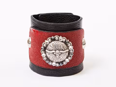 Ein außergewöhnliches Armband, hergestellt aus außergewöhnlichen Ledern. Als Untermaterial dient besonders weiches Rindsleder, das für einen hohen Tragekomfort sorgt. Blickfang ist der Einsatz aus exklusiver Perlrochenhaut. Millionen eng aneinander liegende Kügelchen schaffen eine ungewöhnliche Optik. Als Verzierung dient ein großer runder Concho mit einem Bullenschädel als Motiv. Eingefasst ist der Concho mit Swarowski-Crystal- sowie Jet-Hematite-Steinen. Je nach Lichteinfall glänzen sie schwarz oder silber.