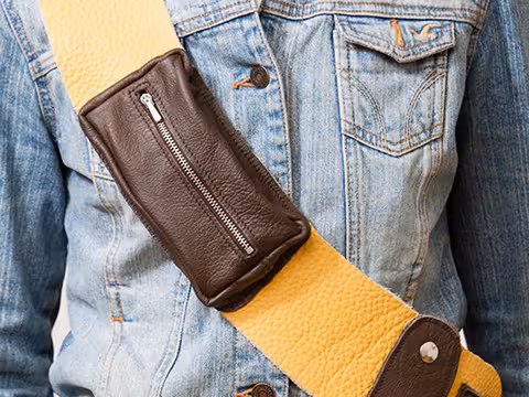 Diese praktische Tasche ist äußerst widerstandsfähig und sehr bequem über der Schulter zu tragen. Hierfür sorgen die ausgewählten Materialien. So werden die Gurte aus robustem gelbem Bullendickleder mit natürlicher Narbenstruktur hergestellt. Die Fächer und Riemen bestehen aus weichem Rindsleder in Braun. Sie ist speziell für die Bedürfnisse des Hundehalters beim Spaziergang entworfen worden. So verfügt sie über eine Haltevorrichtung für die Hundeleine. Diese kann an einer Metallöse festgemacht und mithilfe zweier Schlaufen fixiert werden. Damit wird verhindert, dass sich der Hund beim Spielen in einer lose herabhängenden Leine verfängt und verletzt. Außerdem eignen sich die Schlaufen auch zum Verstauen zum Beispiel von Spielzeug. Die Tasche verfügt über zwei Fächer. Das große ist bestens geeignet zum Unterbringen beispielsweise einer Erste-Hilfe-Ausrüstung, eines Trinknapfes oder von Leckerlis. Integriert ist eine spezielle Halterung, zum Beispiel für kleine Trinkflaschen. Das kleine Fach ist wie geschaffen für ein Handy. Die Tragegurte sind leicht in seiner Länge verstellbar und werden mit einem silberfarbenen Steckschließer verriegelt. Wie alle unsere Multifunktionstaschen, so wird auch die Yellowstone exklusiv für Rock’n’Roll Dogs von einer kleinen deutschen Sattlerei in Handarbeit gefertigt.