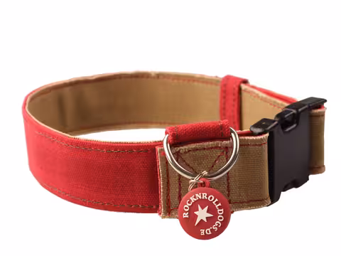 Das Rigger haben wir als Wendehalsband konzipiert. Es kann von beiden Seiten getragen werden. So sind beide Seiten farblich unterschiedlich gestaltet. Das Rigger ist angenehm leicht und dadurch besonders für heiße Sommertage geeignet. Gefertigt wird es aus robustem Segeltuch. Dieses ist mit Antikwachs impregniert. Zum einen macht es das Rigger besonders widerstandsfähig. Zum anderen verleiht es ihm den typischen Gebraucht-Look. Das Rigger Hundehalsband verfügt über einen Klickverschluss aus Kunststoff. Das Material ist äußerst pflegeleicht. Wir bieten das Halsband in vier Farbkombinationen an: Rot/Dunkelblau, Orange/Jeansblau, Orange/Khaki sowie Rot/Khaki. Darüber hinaus gibt es auch eine Version ausschließlich in Khaki.